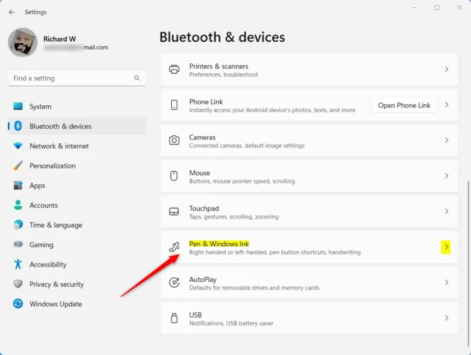 Selecione o bloco Caneta e tinta do Windows à direita para expandi-lo.