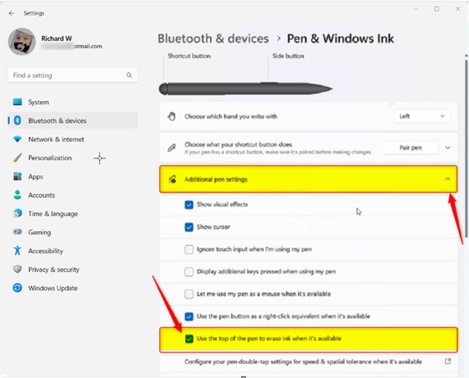 Veja como personalizá-lo para usar a parte superior da caneta para apagar tinta no Windows 11.