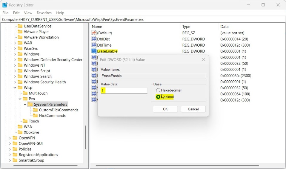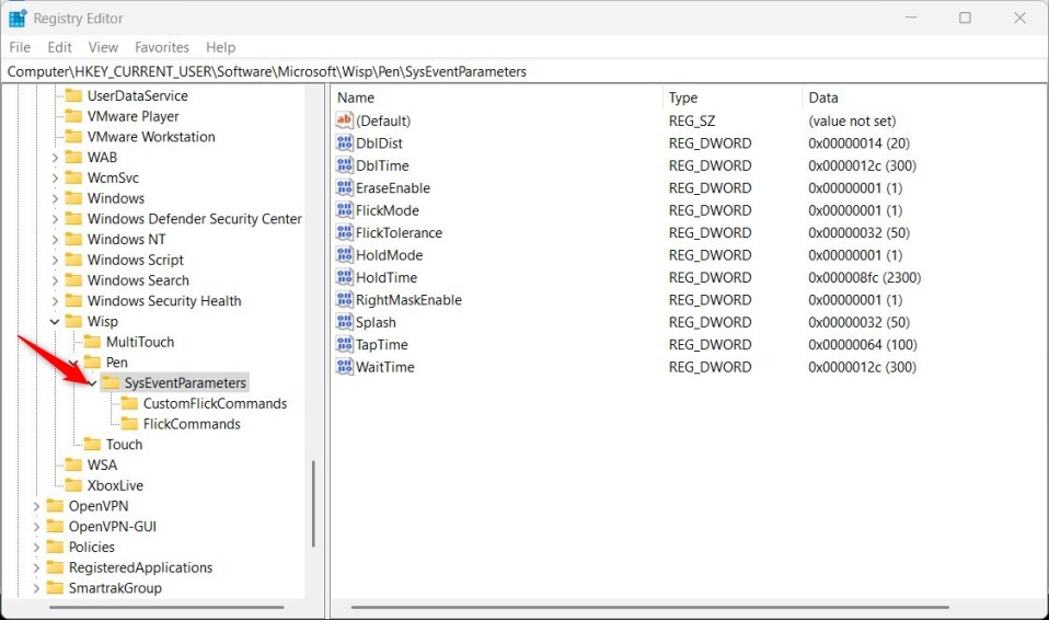 HKEY_CURRENT_USER \Software\Microsoft\Wisp\Pen\SysEventParameters