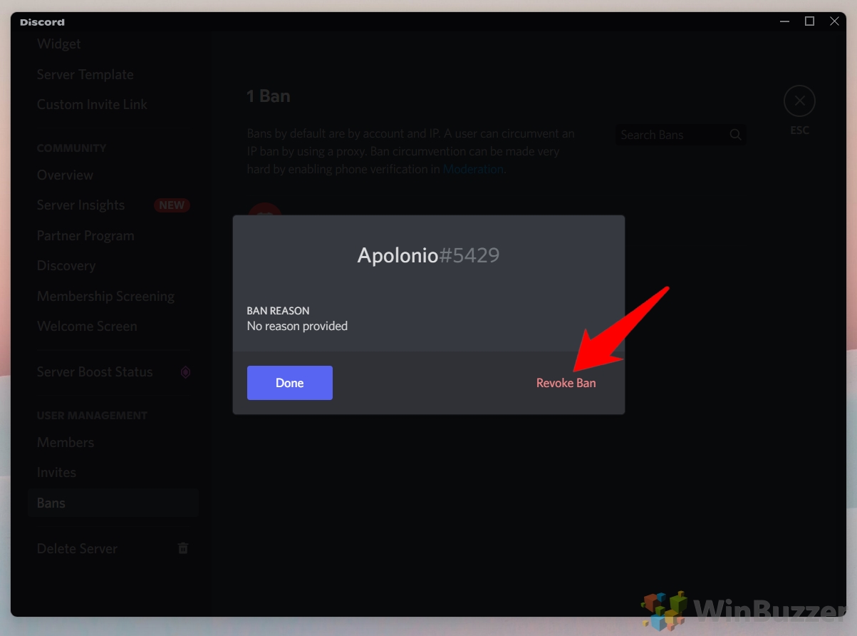 Clique em”Revogar banimento”para cancelar o banimento do usuário novamente