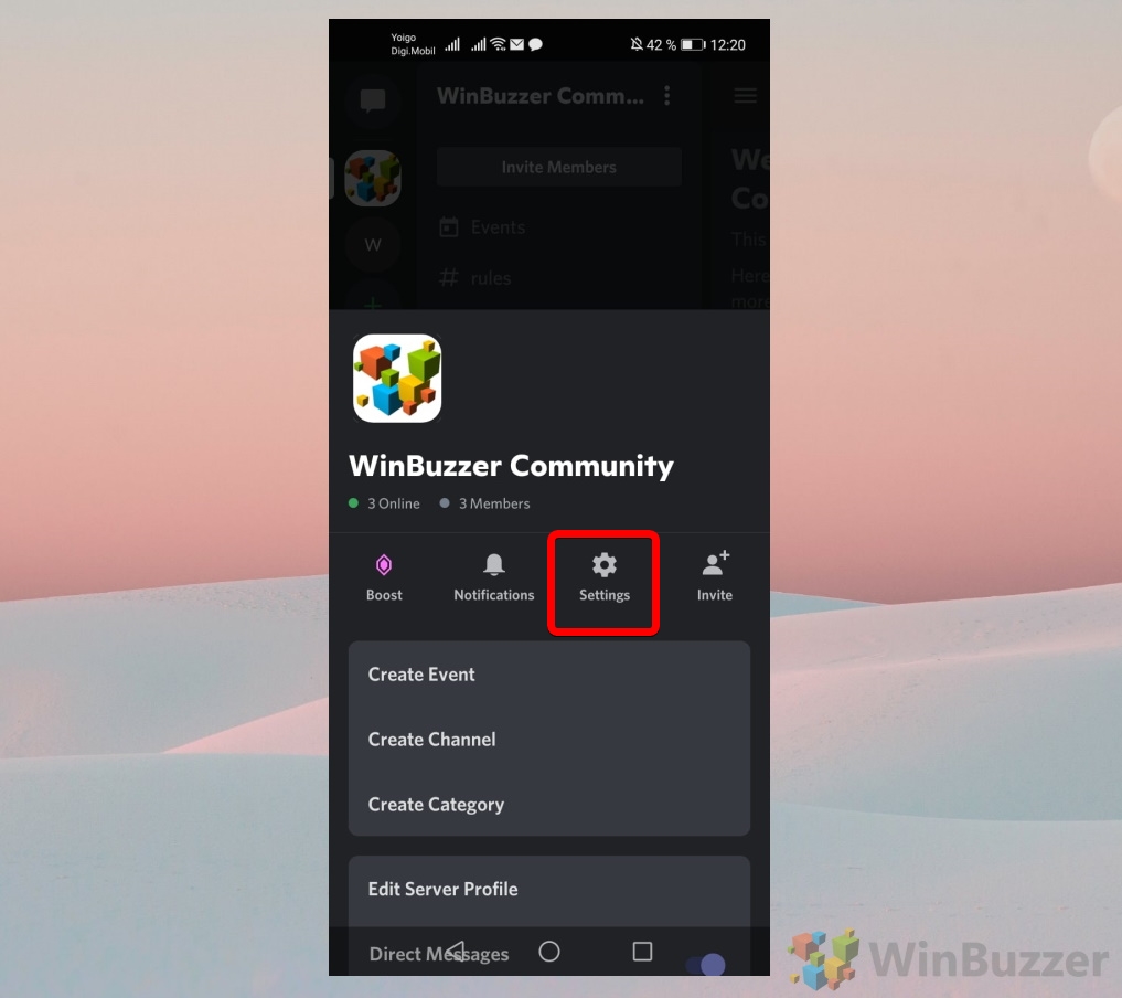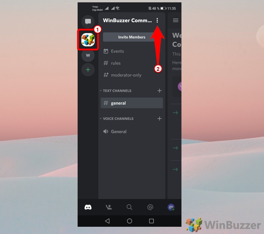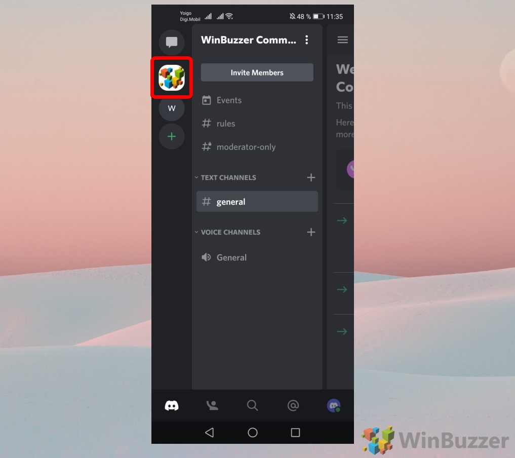 Selecione o servidor/canal do Discord onde deseja banir um usuário e toque no menu botão