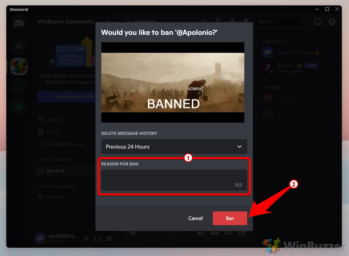 Opcionalmente, você pode fornecer um motivo pelo qual decidiu banir o usuário do Discord.