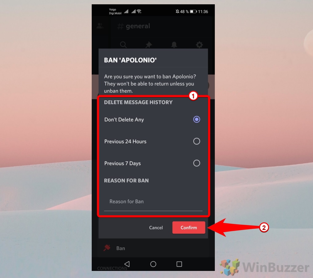 Selecione se deseja excluir o histórico de mensagens deste usuário no servidor do Discord e toque em”Confirmar”