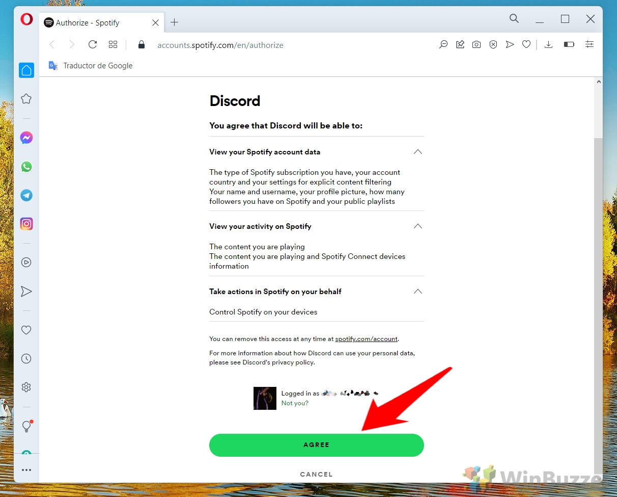 Uma janela pop-up aparecerá solicitando que você faça login na sua conta do Spotify e autorize o Discord a Acesse isso. Digite suas credenciais do Spotify e clique em Concordo.