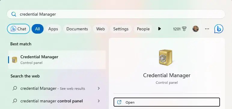 Pressione a tecla Windows no teclado para abrir o menu Iniciar. Em seguida, digite Gerenciador de credenciais e clique com o botão esquerdo no resultado superior. Isso abrirá a janela Gerenciador de credenciais.