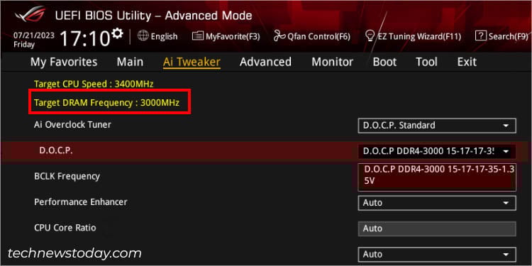 Agora, verifique a frequência desejada, junto com os tempos e a voltagem. Assim como a minha, vou mudar a velocidade da RAM de 2133 MHz para 3000 MHz, o que é realmente um overclock significativo. stoday.com/wp-content/uploads/2023/07/check-docp-profile-frequency-timing-and-voltage.jpg”height=”375″width=”750″>