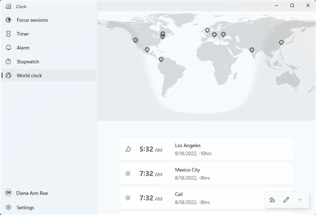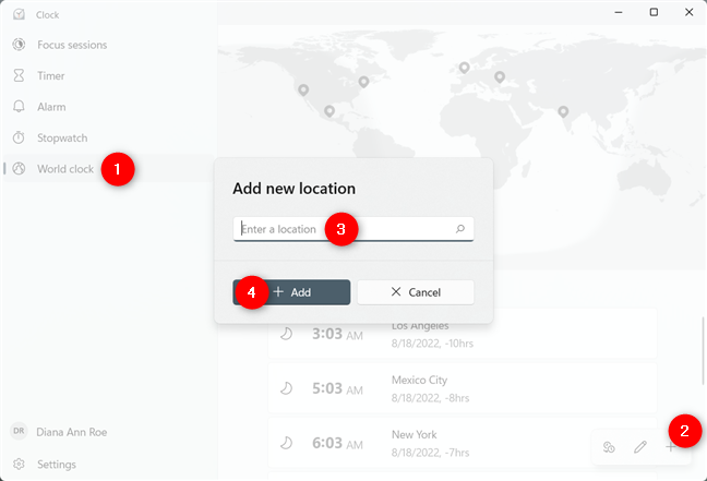 Adicione um novo local na guia Relógio mundial do aplicativo Relógio do Windows