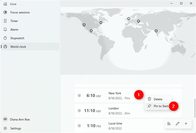 A seguir, à direita clique ou pressione e segure em qualquer local exibido na guia Relógio mundial para abrir um menu contextual. Em seguida, clique ou toque em Fixar para iniciar.
