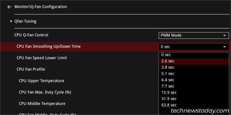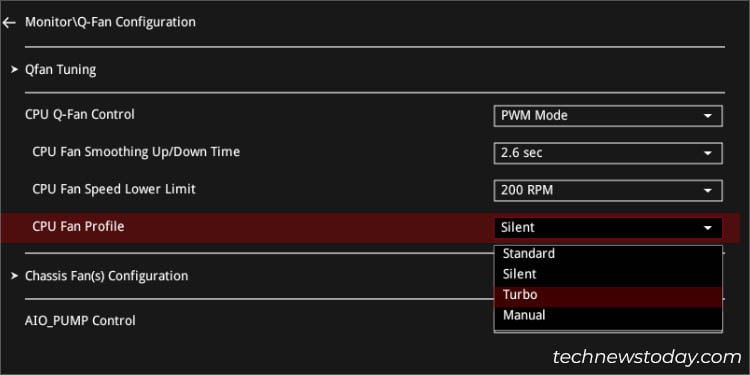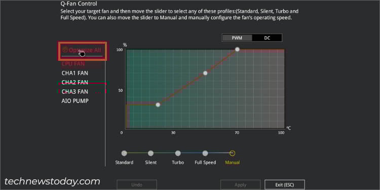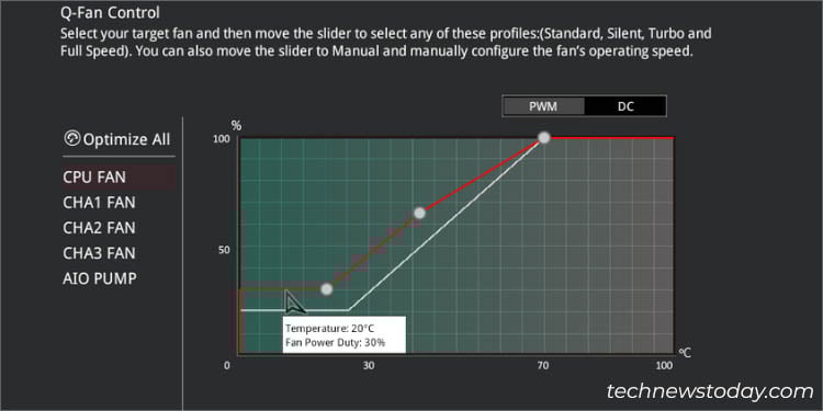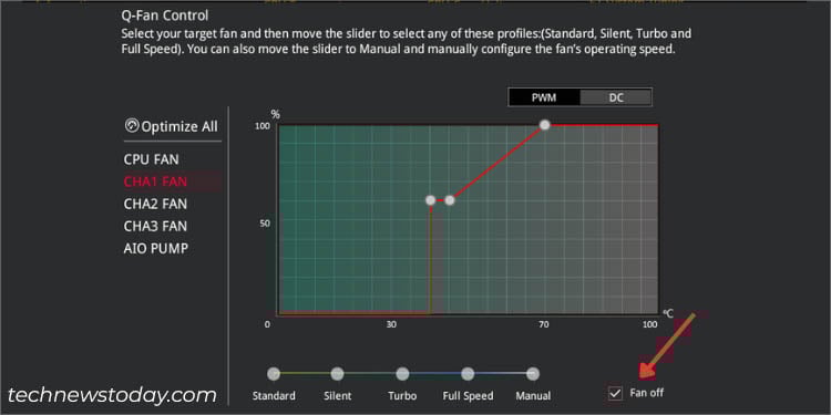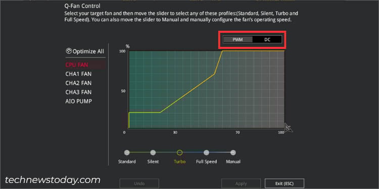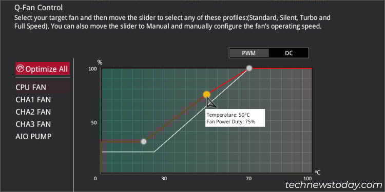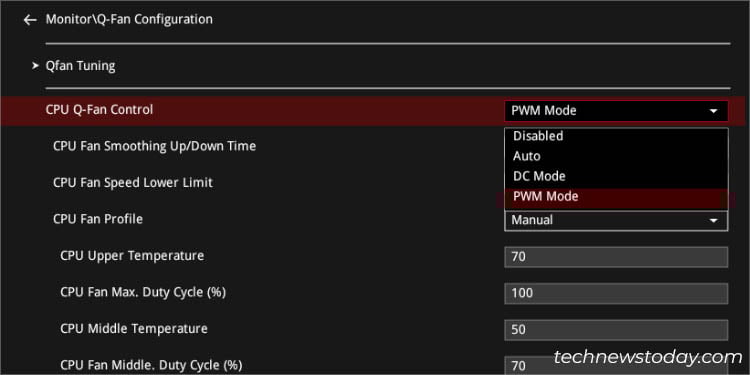 Comece selecionando seu Modo de controle Q-Fan preferido. Embora você possa deixar a opção como Automático, sempre prefiro escolher o certo – PWM para quatro pinos e DC para três.