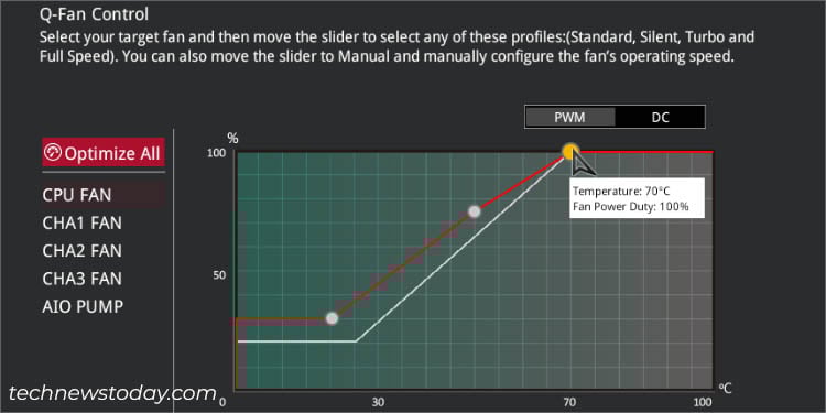 A maioria dos ventiladores atualmente está equipada com um quarto pino adicional para controle preciso do ventilador. Portanto, é essencial escolher o modo PWM para obter o máximo de benefícios. Mas se você conectou uma ventoinha antiga de 3 pinos à placa-mãe, é melhor ir para o modo DC, pois eles não suportam controle de pulso.
