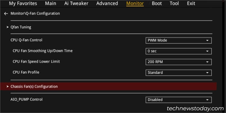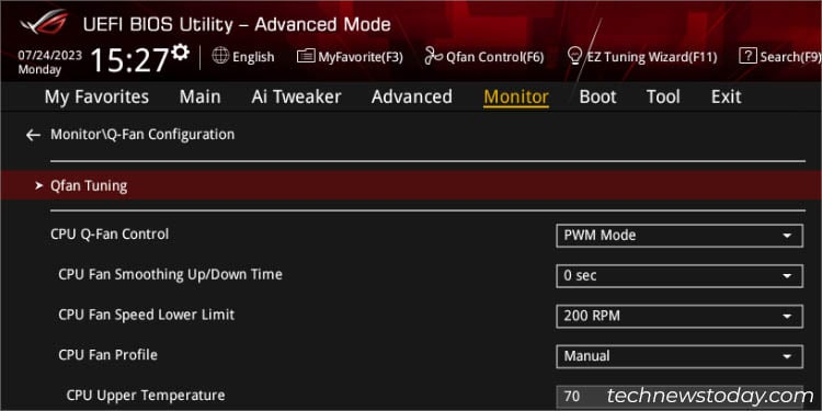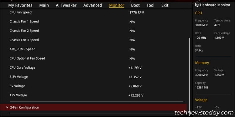 Em primeiro lugar, acesse o ASUS BIOS usando F2 ou Del quando seu PC estiver fazendo POST. Mude para o modo Avançado pressionando F7 (se necessário). Em seguida, navegue até Monitorar. Role para baixo e escolha Configuração do Q-Fan.