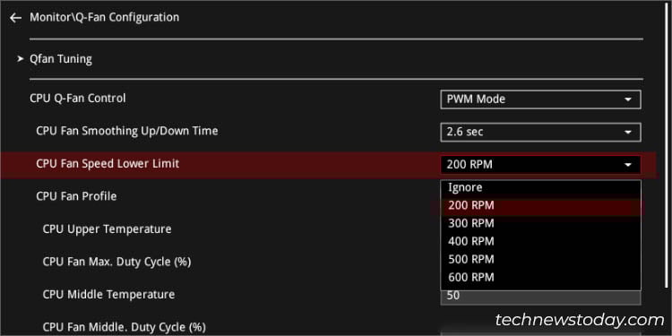 O modo avançado em A ASUS oferece uma seção dedicada para cada ventoinha conectada à placa-mãe. Vamos falar sobre como você pode configurar os ventiladores da CPU primeiro: