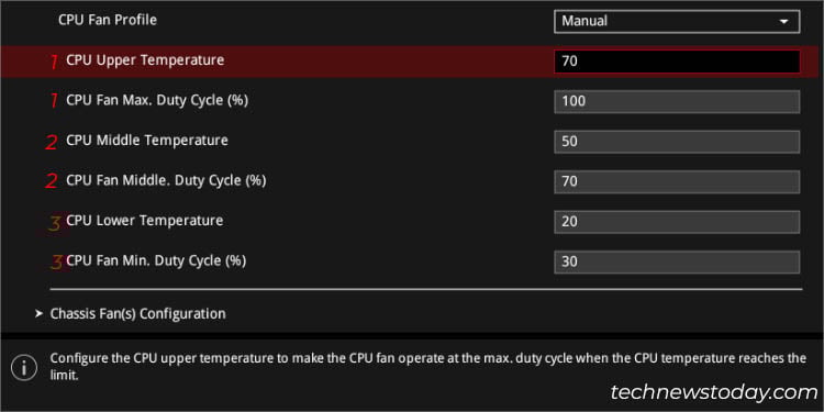 No entanto, você não encontrará a configuração da curva de velocidade do ventilador aqui. Em vez disso, você precisa definir o ciclo de trabalho max/middle/min duty cycle com base na temperatura superior/média/inferior. Sem tornar mais complexo, aqui está um guia passo a passo para ajudá-lo.