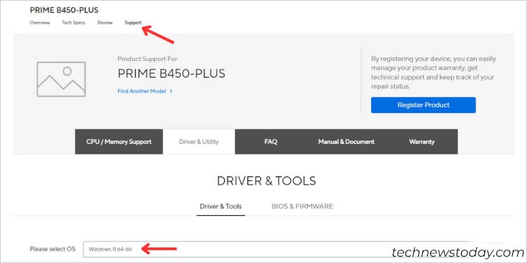 Em seguida, mude para a página Suporte . Em seguida, vá para Driver e utilitário > Driver e ferramentas. Verifique se você selecionou o sistema operacional apropriado.