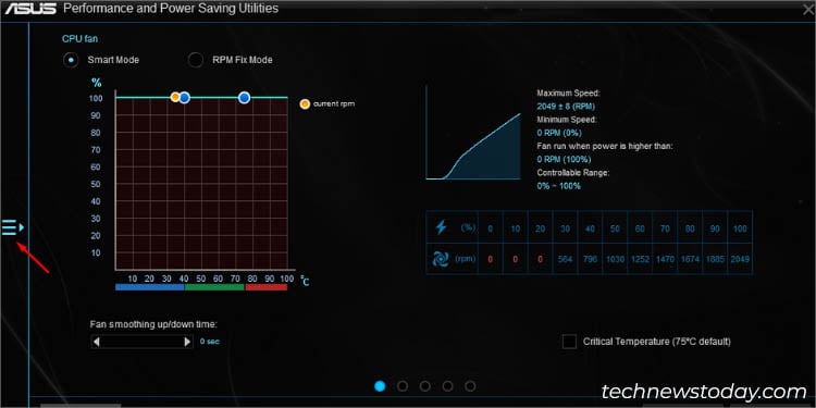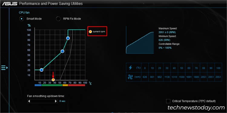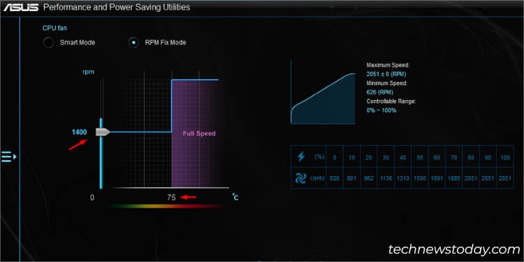 Mesmo se você tentar movê-lo para baixo, isso afetará o primeiro nó. Assim, você não precisa se preocupar, pois não cometerá erros. É sempre melhor manter o nó final em 100%. Com foco na temperatura, a ASUS recomenda que o ciclo de trabalho seja de 75°C.