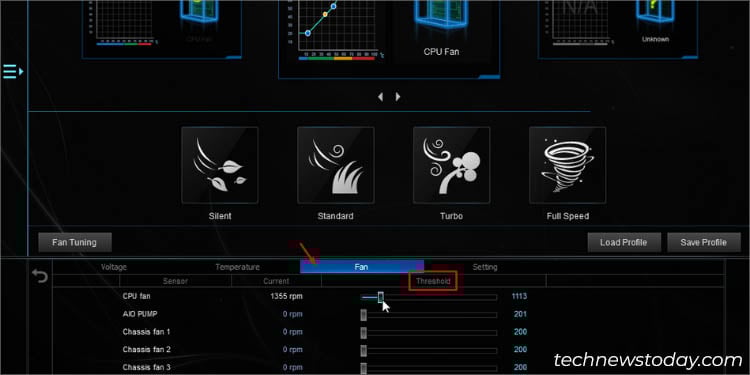 Alterne para a guia Fan . Em seguida, verifique o campo Limiar e mova o controle deslizante para o RPM mínimo desejado em que deseja que os ventiladores funcionem.