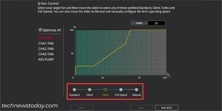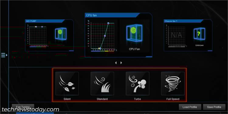 Na seção inferior, selecione qualquer um destes cinco perfis: Padrão: ajusta automaticamente o ciclo de trabalho com base na temperatura da CPU. Silencioso: minimiza drasticamente a velocidade do ventilador para uma operação mais silenciosa. Turbo: Configuração agressiva do ventilador que tenta atingir o ciclo de trabalho máximo na temperatura mais próxima possível. Full Speed: Atinge o RPM máximo possível, independentemente da temperatura da CPU. Manual: permite definir uma curva manual de velocidade do ventilador com parâmetros detalhados (vá para a próxima seção para aprender como fazer isso).