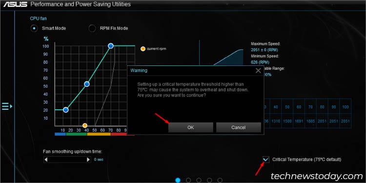 Além disso, você pode marcar a opção dedicada para configurar uma temperatura crítica. Mas observe que definir o limite superior a 75°C pode levar a instabilidades do sistema. Você ainda receberá uma mensagem de aviso do ASUS AI Suite. Pressione Ok para continuar.