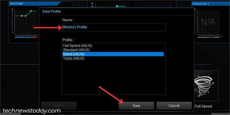 Volte para a tela principal do Fan Xpert. Pressione o botão Salvar perfil.