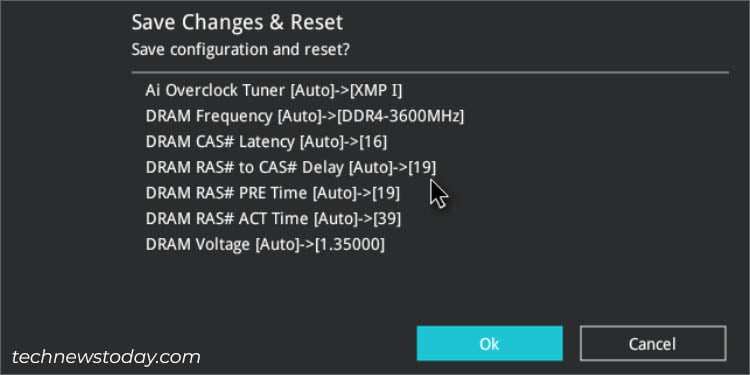 Faço isso pressionando a tecla F10, seja no modo EZ ou Avançado. Depois disso, um prompt de confirmação deve aparecer onde você pode verificar as configurações que serão aplicadas quando você reiniciar seu PC ASUS. Pressione Ok para salvar as alterações e saia do modo BIOS.