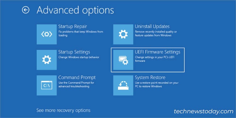Muitas vezes, esquecemos de pressionar a tecla dedicada ou, em vez disso, usamos uma tecla imprecisa aquele que inicializa o Windows. Está tudo bem-você não precisa reiniciar. Basta acessar as Opções avançadas de inicialização, onde você pode selecionar Solução de problemas > Opções avançadas > Configurações de firmware UEFI.