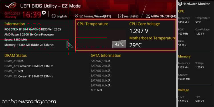 No modo EZ, você pode procurar as seções dedicadas (como demonstrado na figura) para recuperar os detalhes. Por outro lado, o status DRAM e SATA fornece uma ideia clara de quais slots/conectores seus componentes estão conectados.
