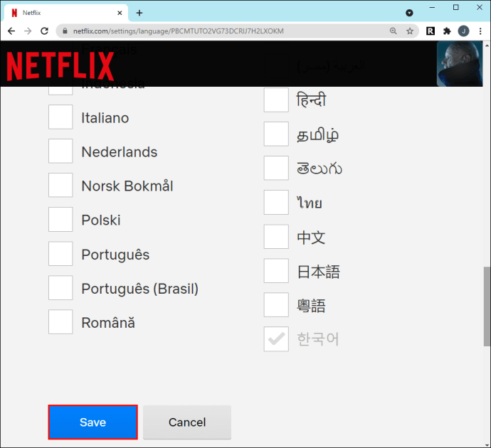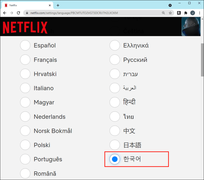 Como a Netflix oferecerá idiomas com base em sua localização, o coreano deve estar na lista se você mora na Coreia do Sul. No entanto, se você mora nos Estados Unidos, você terá que usar o primeiro método para alterar o idioma das legendas.