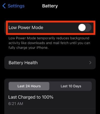 Ativar o modo de baixo consumo é um ótimo recurso, mas pode prejudicar a funcionalidade de alguns aplicativos e configurações para economizar bateria. Se você ativou isso, tente desativá-lo. Depois de fazer isso, seu tempo de uso pode funcionar sem problemas.