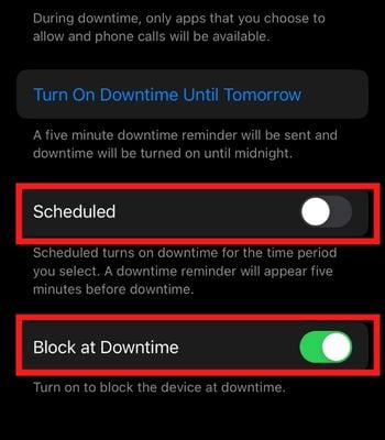 Embora você possa ter ativado o limite de aplicativos, alguns aplicativos ainda podem funcionar se você não tiver ativado o recurso de tempo de inatividade. Você pode ativar isso para permitir as chamadas ou aplicativos de sua escolha. Além disso, você também pode personalizar os horários de início e término para disponibilizar os aplicativos específicos por um determinado período.