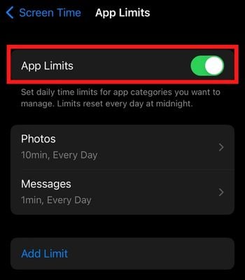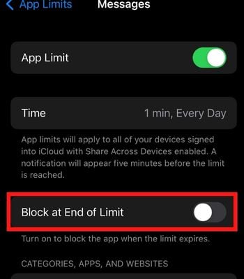 Quando o limite de tempo de tela for atingido, seu dispositivo ainda permitirá que você use o telefone por algum tempo. Se você não quiser que isso aconteça, você precisa alternar para o Bloqueio no Fim do Limite. Depois de ativá-lo, o limite do aplicativo de tempo de tela pode ter um desempenho melhor.