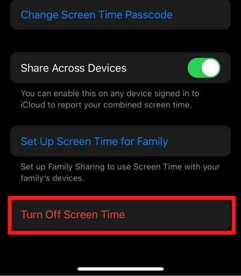 Este é um método simples que você pode tentar. Desativar e reativar o Tempo de tela pode atualizar rapidamente a configuração. Quando você faz isso, pode ajudar a resolver o problema em muitos casos. Mas, o decepcionante é que seus dados de tempo de tela anteriores serão removidos. Então, você precisa configurar tudo desde o início.