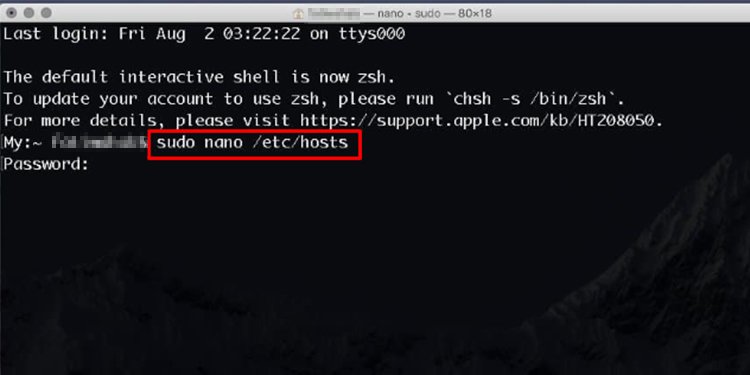 Na barra de menu, clique no ícone que se parece com uma lupa.Digite Terminal e abra-o.Insira o seguinte comando na janela. A janela solicitará que você insira sua senha de administrador. exibirá o banco de dados do host do seu dispositivo. Vá para o final do banco de dados usando as teclas de seta. No final, digite 127.0.0.1 [o domínio do site que você deseja bloquear]