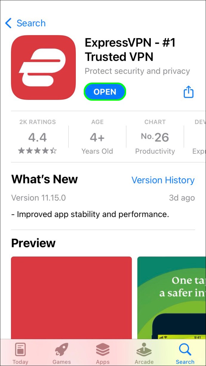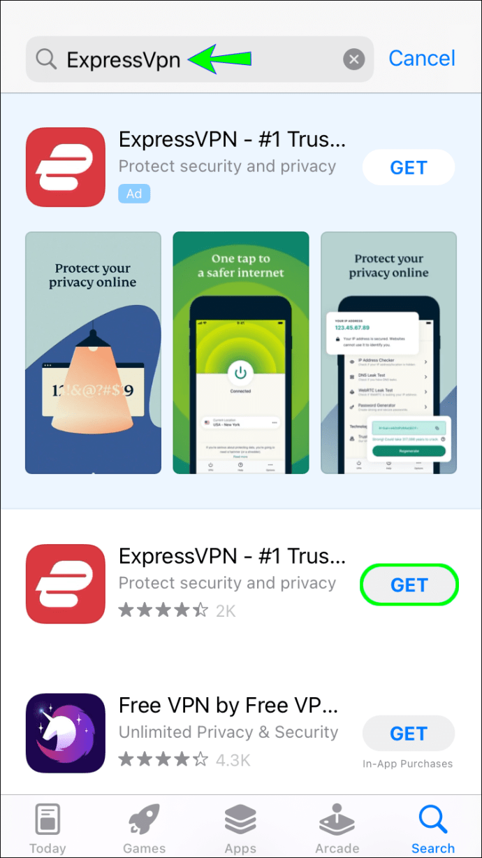 Assine para ExpressVPNVá para a App Store. Pesquise por”ExpressVPN”. Selecione o primeiro resultado que aparecer.