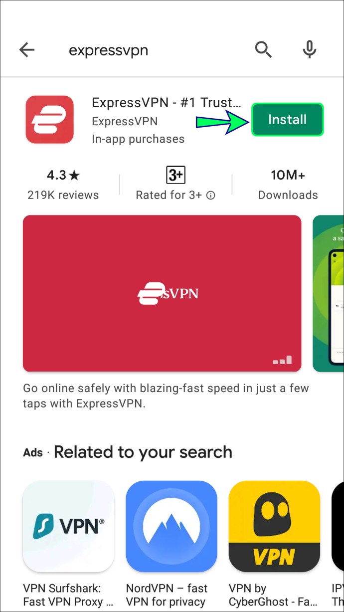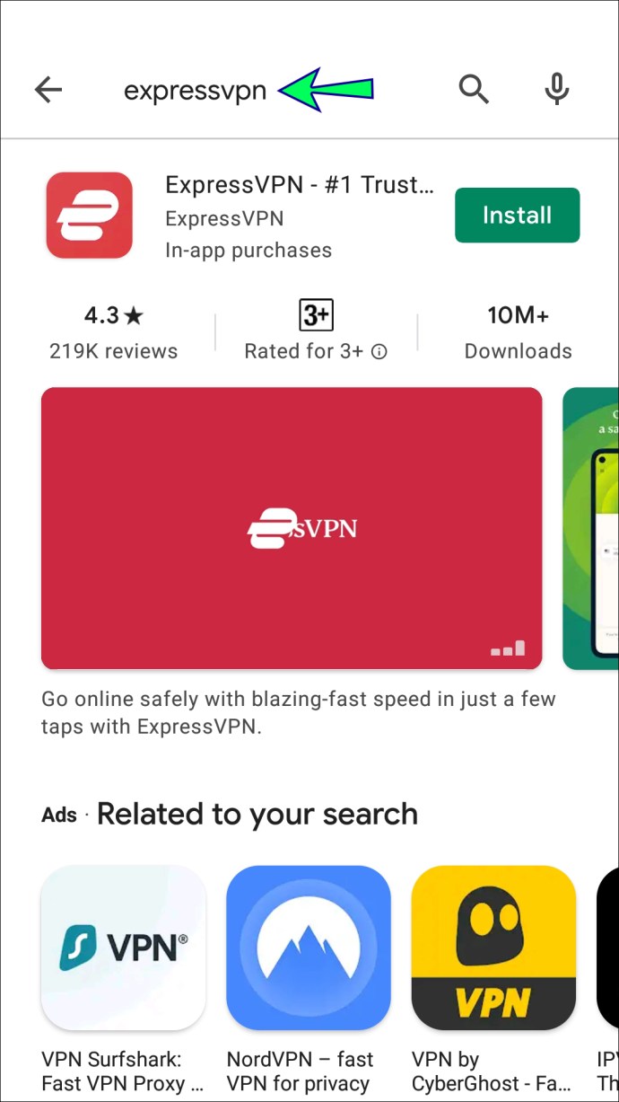 Inscreva-se para um Conta ExpressVPNVá para a Google Play Store.Pesquise”ExpressVPN”na barra superior e selecione o primeiro resultado.