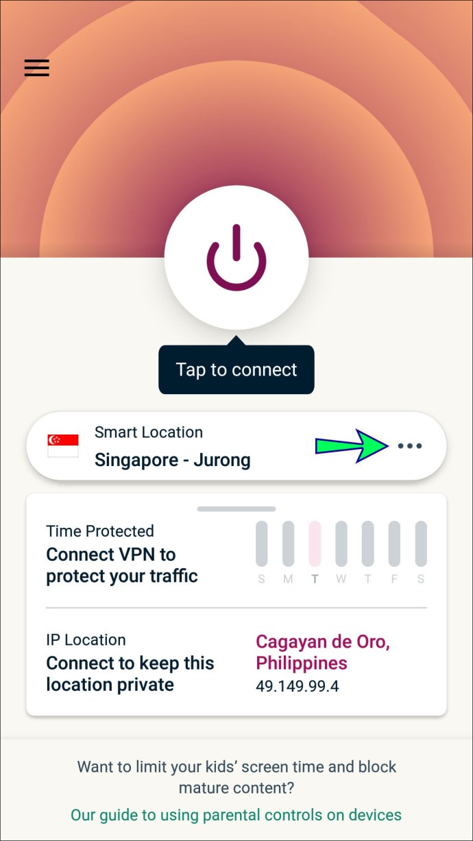Com o aplicativo ainda aberto, use o seletor de servidor para escolher um servidor que funcionará com DraftKings. Os servidores baseados nos EUA ou no Canadá funcionam melhor aqui, especialmente se o seu estado tiver todas as funcionalidades disponíveis. O aplicativo encaminhará você automaticamente para os servidores mais comuns, mas você pode usar o menu de três pontos para alterá-lo.
