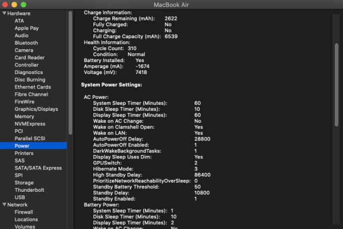 Se você estiver usando um MacBook, poderá ver facilmente se há um problema com a bateria segurando o botão”control”e clicando no botão”Logotipo da Apple”no canto superior esquerdo. Escolha”Informações do sistema”. Uma nova janela é aberta. Clique em”Energia”. Verifique para ver o status da bateria. A bateria está listada como”normal”na seção”Condição”na captura de tela abaixo.