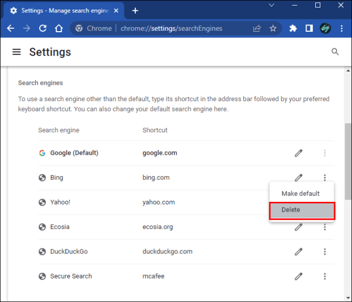 Para evitar que o Bing funcione em segundo plano em seu navegador, você precisa removê-lo de seus mecanismos de pesquisa. Isso é diferente de alterar o mecanismo de pesquisa principal. Quando você altera o mecanismo de pesquisa principal, o Chrome ainda se conecta ao Bing. Siga estas etapas para se livrar do Bing de seus mecanismos de pesquisa aprovados no Chrome: