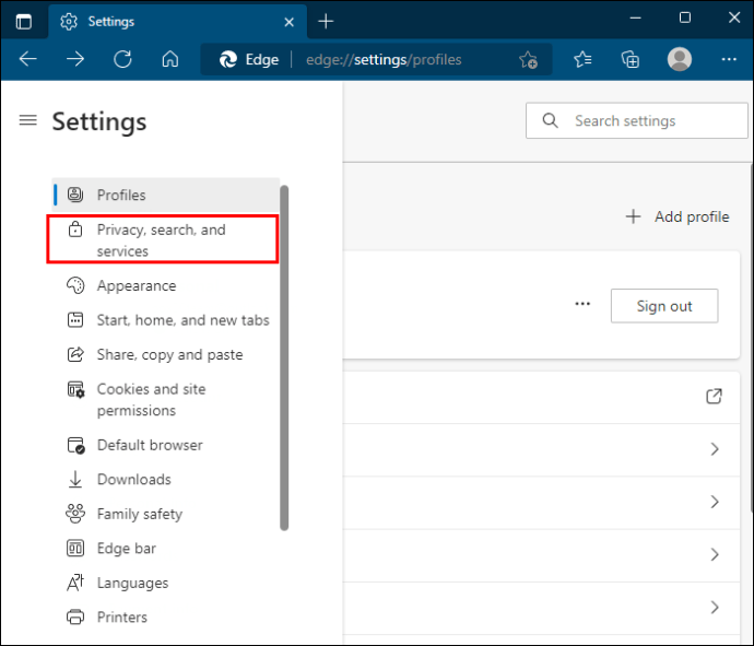 Selecione”Configurações”e clique em”Privacidade, pesquisa e serviços.”