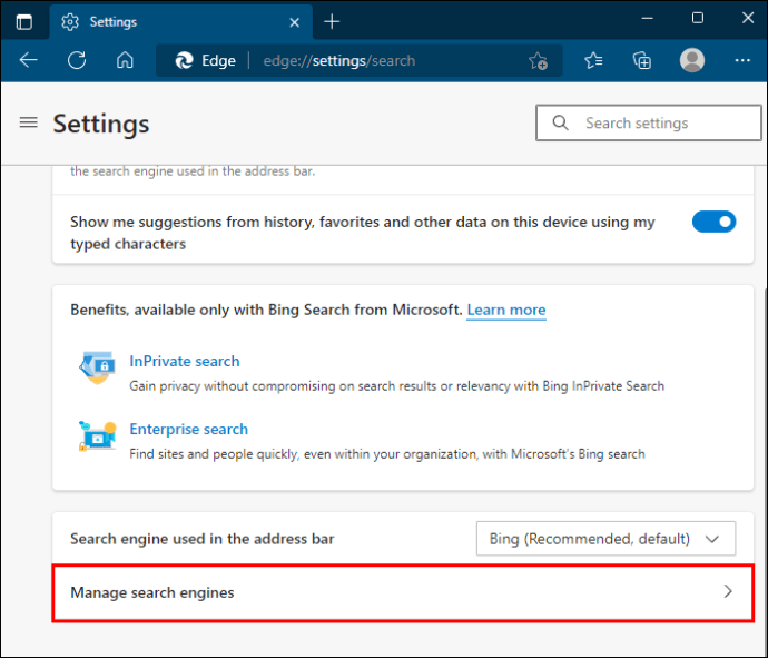 Encontre”Barra de endereços e pesquisa”e escolha qualquer mecanismo de pesquisa, exceto Bing.