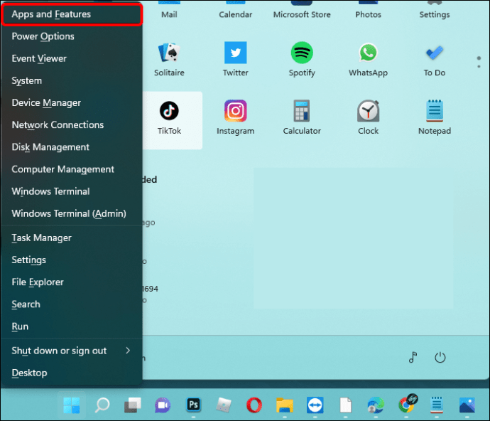 Pressione a tecla Windows e X.Selecione”Aplicativos e recursos.”