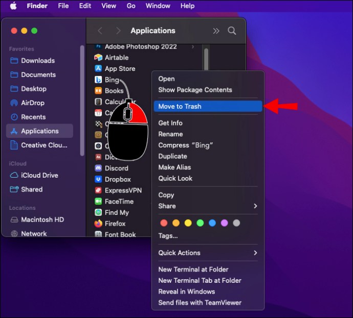 Clique com o botão direito do mouse no aplicativo e clique em “Mover para a lixeira.”