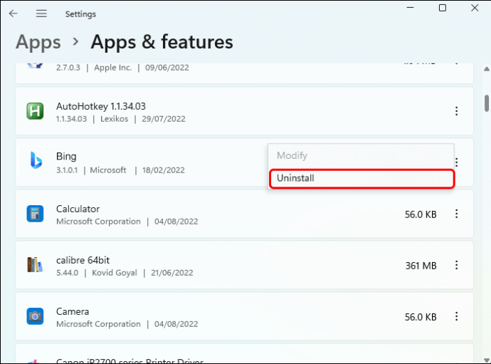 Apesar desse vírus comum, o Bing é um programa legítimo integrado aos produtos da Microsoft. Se você não gostar, poderá removê-lo permanentemente usando o mesmo método que faria ao remover a versão viral.