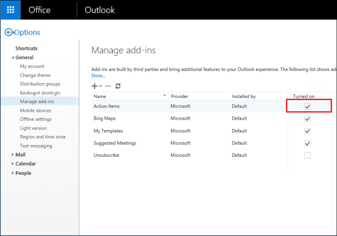 Encontre”Bing Maps”e desmarque a caixa na coluna”Ativado”.Recarregue seu Outlook para certificar-se de que a alteração ocorreu.
