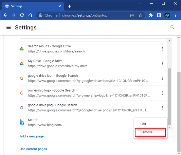 Essas são as páginas para as quais o Chrome leva você automaticamente quando você abre o Chrome. Uma maneira de o Bing sequestrar o Chrome é inserir-se nas páginas de inicialização. Para remover o Bing de suas páginas de inicialização: