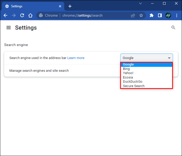 No menu suspenso, escolha qualquer opção, exceto Bing.