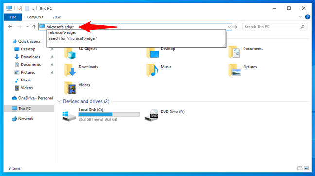 O File Explorer também oferece uma maneira conveniente de iniciar o Microsoft Edge. Abra o Explorador de Arquivos (Win + E) e, em sua barra de endereço, digite: