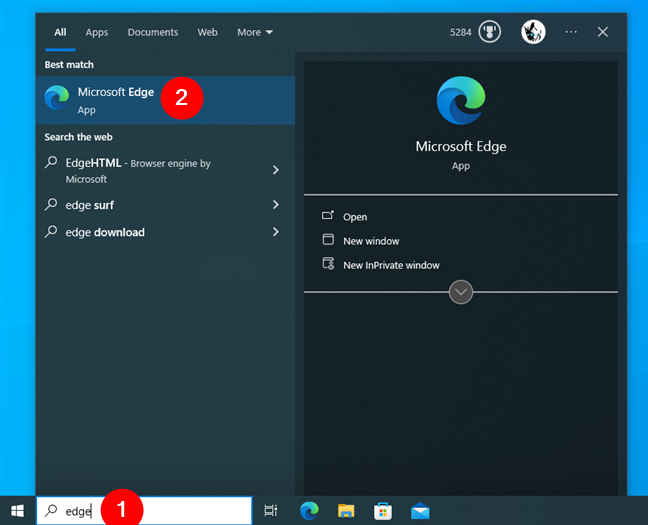 Você também pode abrir o Microsoft Edge digitando edge na caixa de pesquisa encontrada na barra de tarefas do Windows 10 ou Windows 11. Assim que os resultados da pesquisa chegarem, clique ou toque no resultado do Microsoft Edge ou pressione Enter no teclado.