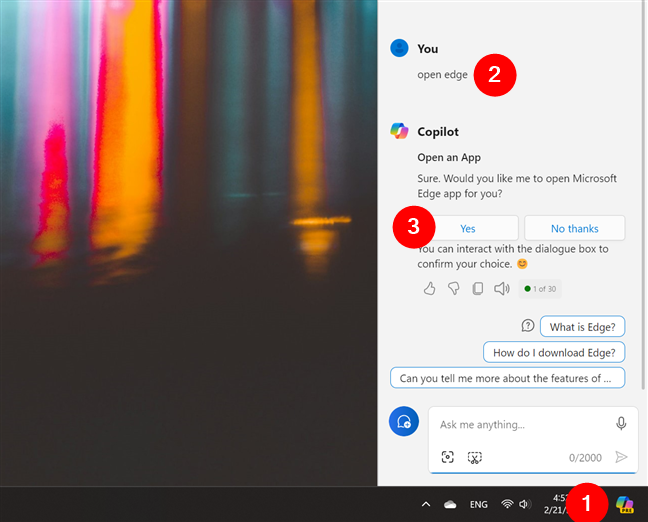 O Copilot também pode ajudá-lo a iniciar o Edge, tanto no Windows 11 quanto no Windows 10. Primeiro, ative o Copilot clicando ou tocando em seu ícone na barra de tarefas. Em seguida, digite uma solicitação como esta: