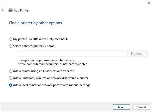 Se a instalação manual ou a adição de uma impressora usando uma nova porta não funcionar, você também pode tentar adicionar uma impressora usando o console do MMC.