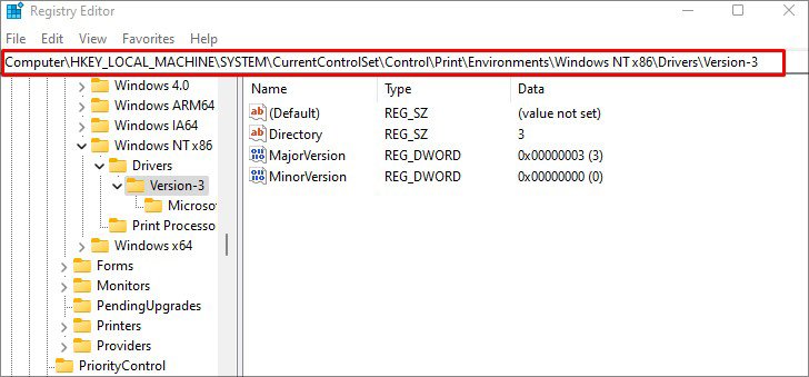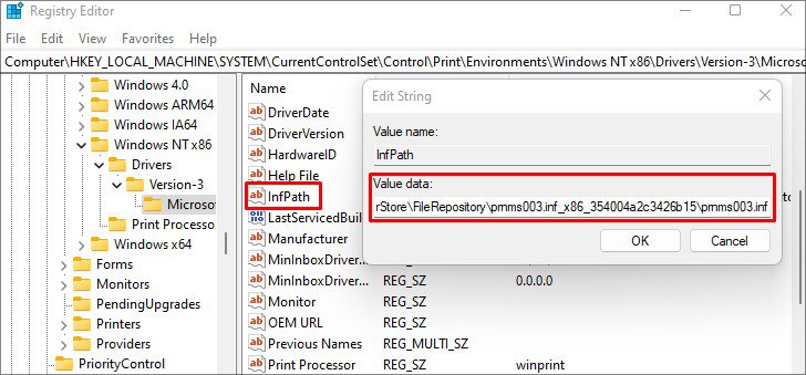 Primeiro, pegue uma unidade USB e vá para o computador onde o driver da impressora está funcionando bem. Nesse computador, abra Executar aplicativo e digite regedit na caixa de texto. Pressione Enter, depois o Editor do Registro será aberto. Enquanto estiver no Editor do Registro, navegue até: Computador\HKEY_LOCAL_MACHINE\SYSTEM\CurrentControlSet\Control\Print\Environments\Windows NT x86\Drivers \Versão-3Neste local, você verá uma lista de impressoras. Escolha a impressora ativa. No painel direito, procure e abra o arquivo InfPath . Lá você terá algo como C:\Windows\System32\DriverStore\FileRepository\prnms003.inf_x86_354004a2c3426b15\prnms003.inf em Dados de valor.